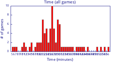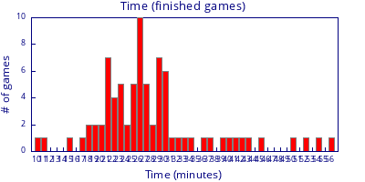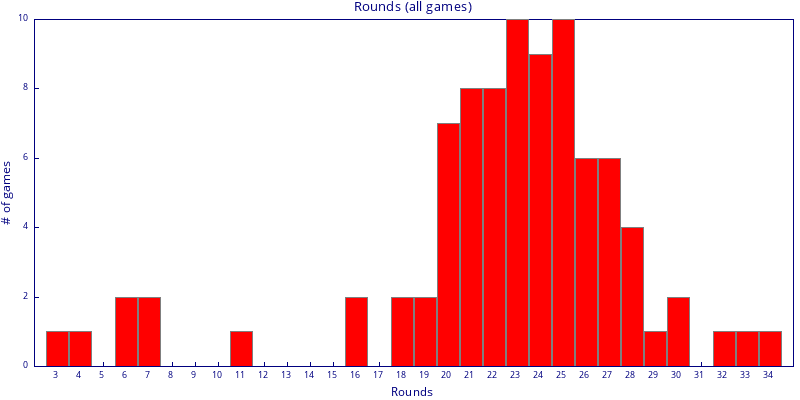 On average, these games had 3.18 players (median 3), lasted for 24 rounds (median 24), and dragged on for 27:41 minutes (median 26:00 minutes).The shortest game took 10:19 minutes, and the longest game took 55:42 minutes. The minimum number of rounds was 16, and the maximum number of rounds was 34.